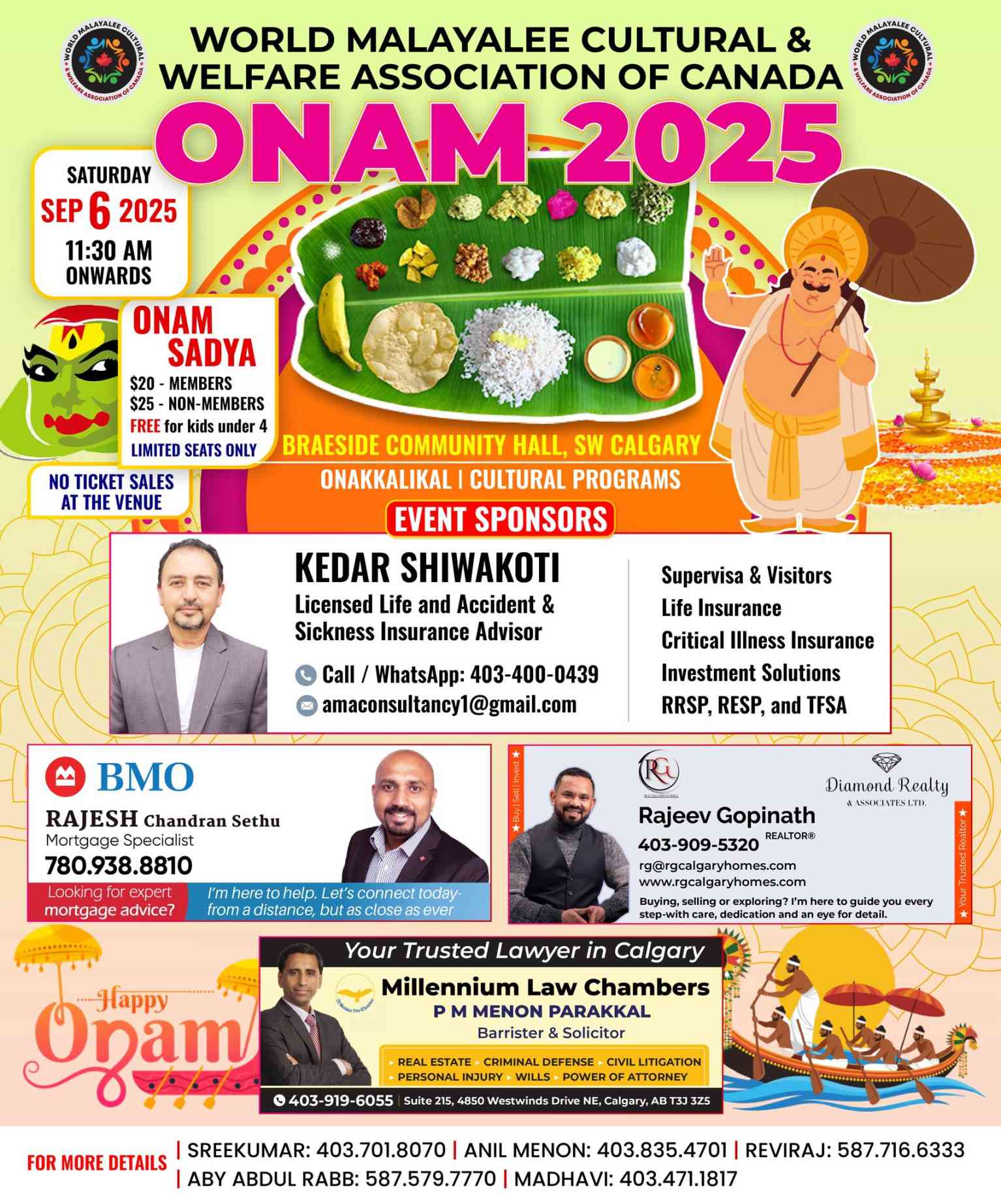 World Malyalee Cultural & Welfare Association of Canada Presents Jingle Beats 2025 - on Dec 19th 2025 Door opens at 5:45 pm Food will be served from 6:00 pm - 7:00 pm only Free entry for kids under the age of 4 Dinner Menu (Non-Veg) 🍗 Gopi Manjurian Dry Kallapam Veg Pulao Chicken  curry Dessert […]